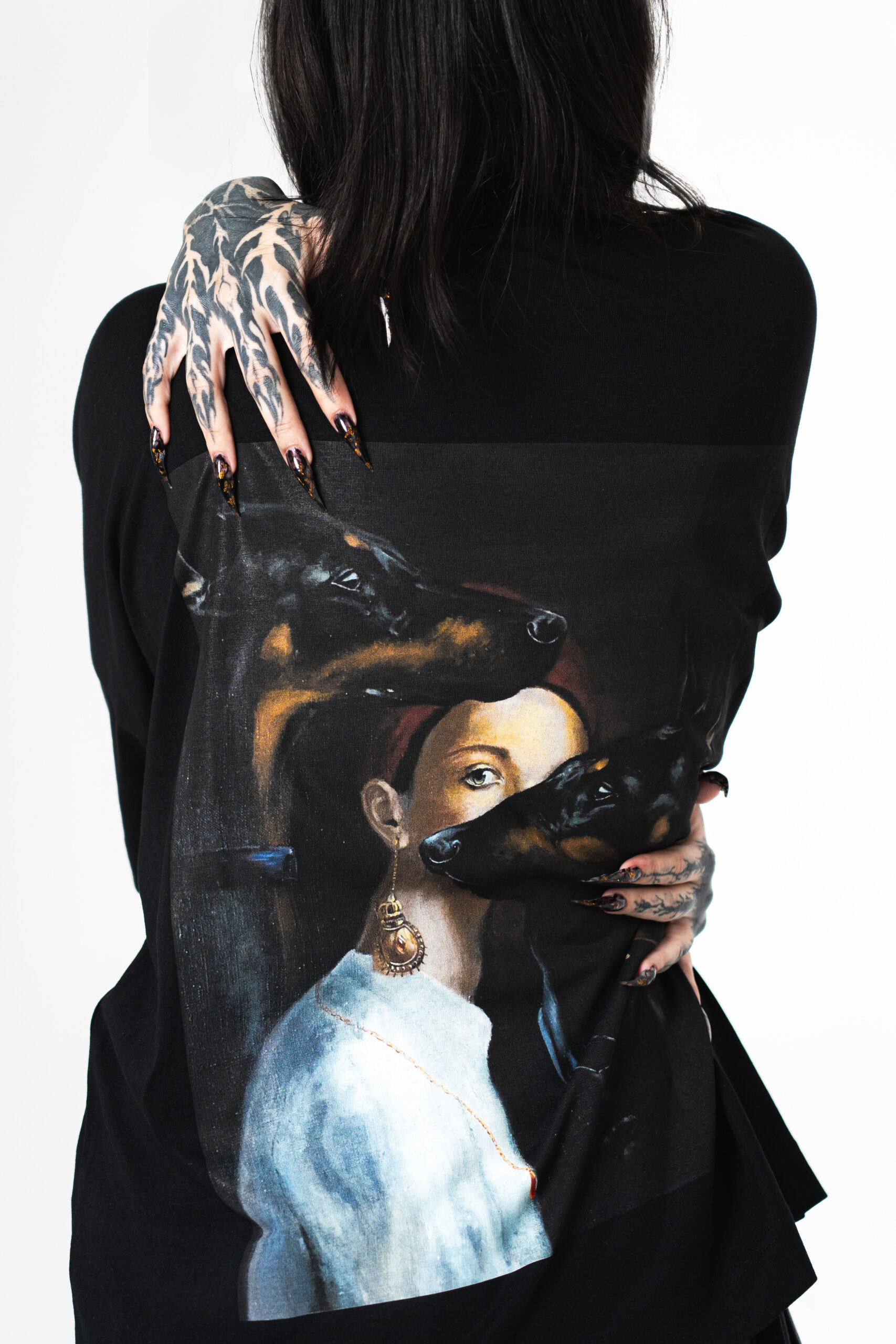 Aprašymas: oversize, unisex, trumpos rankovės, nuleisti pečiai, aukšta plati apykaklė